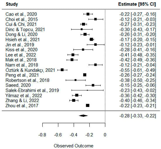| Hsieh et al., 2021 [53] | China | Asia | 6233 | 51 | CIAS | CD-RISC 10 | Under | −0.17 | |