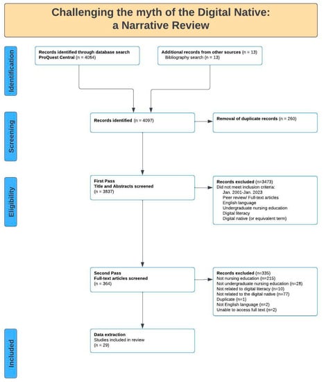 A literature search of English-language peer-reviewed and full-text articles was conducted using the search terms “education AND nursing”, “digital literacy” and “Digital Native”. Additional search terms of “Net generation”, “Generation Y” and “Google generation” were then applied, as identified by the ECDL (European Computer Driving Licence) [15] in “The Fallacy of the Digital Native.” Identified sources of information were included if they were published between January 2001 and January 2023 to reflect the period of time since the first use of the term Digital Native.