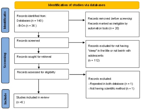 Among the databases used, in total, 140 were obtained. The relevance of these articles was analyzed by reading the title, summary, and, whenever necessary, full-text reading. After applying the inclusion and exclusion criteria, 6 articles were selected, as illustrated in Figure 1.