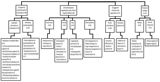 Psychoeducation regarding the wider, holistic impact of ADHD: Our participants cited anxiety as a frequently encountered problem. This is contradicted by some works of literature which found no significant association between ADHD and anxiety [25]. However, it chimes with other studies that suggest it is the most common comorbidity experienced by individuals diagnosed with ADHD [26]. Unsurprisingly, individuals with concurrent anxiety have been shown to be more symptomatic, have lower occupational achievements, and increased levels of anger [27]. Help with anger management was also identified in our study, fitting with other research that found emotional dysregulation and outbursts of temper to be common in people with ADHD [28,29].