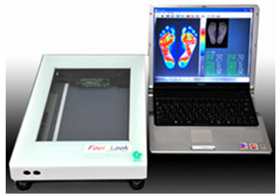 We used assessment methods and three types of measuring devices to obtain foot data on structural and functional aspects, as follows: a Foot Look (Figure 1), a toe grip machine (Figure 2), and a thermometer. The main author developed a two-page recording sheet based on previous studies to record data on the study items [18,39]. The recording sheets were evaluated by two independent researchers before data collection. Table 1 presents the definitions, measurement units, and assessment methods of foot-related items for assessment and measurement of the item selection of the recording sheet (https://footlook.co.jp/, accessed on 1 May 2019). A Foot Look (Foot Look Inc.) was used to measure foot length, foot width, and toe angle from the sole. The device uses a computer and scanner to provide visual images of the soles, including the hallux valgus and floating toe, and the weight distribution of the body to the floor (Figure 1: https://footlook.co.jp/, accessed on 1 May 2019). We also used a toe grip dynamometer to measure toe flexor strength, which indicates toe performance (Figure 2: T.K.K.3364 Takei Scientific Instrument; https://www.takei-si.co.jp/products/719/, accessed on1 May 2019).