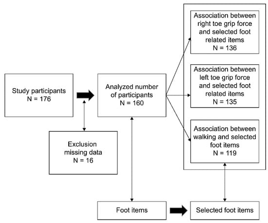 The total number of participants was 160, as shown in the flow diagram of participants in Figure 3. Some missing data were attributed to 10 patients’ inability to step up onto the table of the Foot Look machine because of physical limitations or their inability to grip the bar on the toe grip dynamometer. Some other data could not be obtained because of one-sided paralysis caused by cerebrovascular or hip problems or other issues. Furthermore, one participant could not participate in measurements that required active movement such as spreading the toes. Therefore, the number of participants in the analysis accordingly varied. The sample number was valid for multiple regression analysis, as previously mentioned.