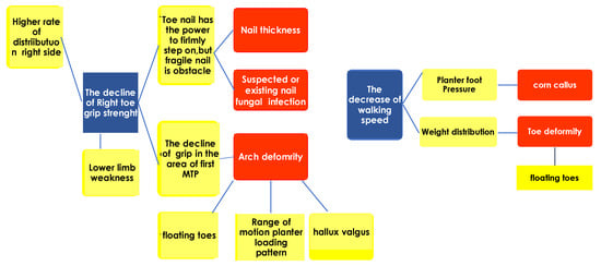 Table 7 presents the results of the multiple regression analysis. Right toe grip strength had a statistically significant association with arch deformity (p = 0.012), suspected or existing nail fungal infection (p = 0.034), and nail thickness of the right foot (p = 0.040). Table 7 shows that corns, calluses, and toe deformities of the right-sided foot were significantly associated with the results of the walking test (p = 0.026 and 0.033, respectively). No significant association was found between left-sided toe grip strength and left-sided foot-related items. Figure 4 illustrates the logical tree obtained from the regression analysis (Table 7).