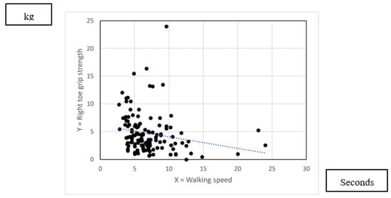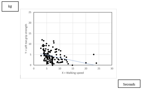 Figure 5 and Figure 6 show the scatter plot indicating the association between toe grip strength and waling speed. As Table 8 indicated, there was poor association between right toe grip strength and walking speed (R = −0.197). There was fair association between left toe grip strength and walking speed (R = −0.329).