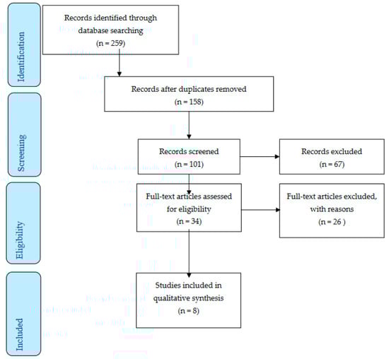 Initially, 259 studies were noted and the title and abstracts of these were carefully screened. In total, 158 studies were excluded since they were found more than one time. A total of 25 were excluded after reading the title, 42 were excluded after reading the abstract and 34 were excluded after reading the full text according to inclusion and exclusion criteria. Therefore, only eight studies were included in the present systematic review. Figure 1 presents the flow chart of the selection of the studies.
