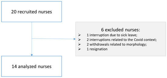 The process of selecting the nurses is summarized in the flowchart in Figure 2. Out of 20 nurses, 14 were selected to test the device, whereas 6 were excluded (1 due to sick leave; 2 due to to the COVID-19; 2 withdrawals were related to morphology; 1 resignation).