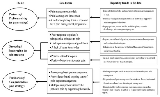 Surgical nurses’ perceptions of the strategies for enhancing pain management proficiency are presented in three themes, including partnering, disrupting, and familiarising oneself with concerns regarding pain management skills (Figure 1). Such strategies in acute and chronic pain management services include solving patients’ problems and encouraging and improving pain management strategies for addressing health challenges within organisations. The themes presented in the results encompassed improvements in pain management and nursing competencies. Advanced healthcare technologies are currently being applied to pain management.