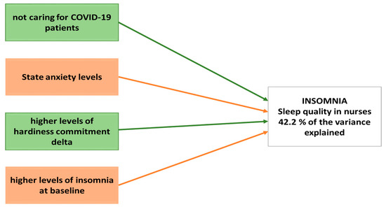 Finally, a generalized linear model was used to calculate the best predictive model for insomnia levels among nurses during the first wave of the COVID-19 pandemic. Our results showed that 42.2% of the variance was explained by four variables: (i) not caring for COVID-19 patients, (ii) higher levels of hardiness commitment delta, (iii) state anxiety, and (iv) higher levels of insomnia at baseline. Indeed, the general linear model takes the original level of insomnia into account, clearly demonstrating that greater initial insomnia results in a lower possibility of symptom progression or deterioration (Table 6 and Figure 1).
