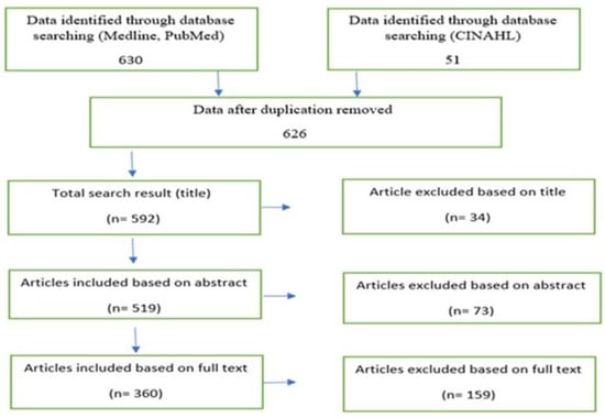 A total of 681 articles were identified during the initial search. These identified articles were analyzed based on the PRISMA flow diagram (Figure 1). This analysis resulted in the removal of 55 articles due to duplication, 34 articles due to the title not being relevant, 73 articles were rejected for abstract review, and 159 articles were rejected for full-text review (Figure 1). As a result, the total number of retrieved articles after the analysis was 360. The excluded articles do not conform to: the first author being a Saudi national; the first and/or coauthor being a Saudi nurse, and the topic being purely nursing.