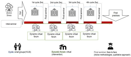 The type of learner, content to be studied, location of the participants in the process and electronic media available are all factors that will determine the model to be implemented. The literature consulted [,,,] shows that mixed learning models—known as “b-learning”—combine the best of virtual methods with face-to-face methods. However, in all of them, it is important to encourage the creation of a learning community—a space for the construction of knowledge where students and tutors can interact [,,]. As a result, active methodologies such as forums, the flipped-classroom or conceptual maps are a strategic framework for student-centered learning, steering trainees toward action [,,].