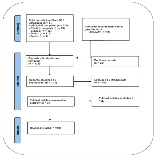 The database search identified 351 records. Two additional studies were identified through the gray literature search. The screening process resulted in the inclusion of 10 studies in this review. Screening process results are presented according to the recommendations of the PRISMA Extension for Scoping Reviews, as shown in Figure 1.