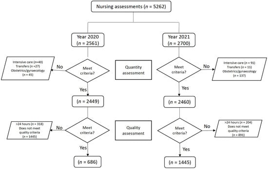 A total of 5262 nursing assessments were initially reviewed for inclusion in the study, 48.7% (n = 2561) belonging to the period of 2020 and 51.3% (n = 2700) to 2021. First, of those belonging to the intensive care unit, 1.56% (n = 40) and 1.76% (n = 45) were from the obstetrics–gynecology unit and 1.05% (n = 27) were excluded because they were transfers in the 2020 period. In 2021, 3.37% (n = 91) were excluded because they belonged to the intensive care unit, 5.07% (n = 137) because they were from the obstetrics–gynecology unit, and 0.41% (n = 11) because they were transfers. Thus, a total of 2449 and 2460 assessments were included to analyze the number of assessments for the periods of 2020 and 2021, respectively. Of the 2449 included in the 2020 period, 12.98% (n = 318) were excluded because they were completed more than 24 h after admission or did not have a completion date, and 59% (n = 1445) were excluded because they were not completed correctly. The final sample consisted of 686 (28.01%) nursing assessments for the 2020 period. In the second data collection period, from October to December 2021, of the 2460 assessments collected, the main reason for exclusion was the noncompletion of any of the scales in 36.21% (n = 891), followed by late completion (>24 h after admission) or not submitting the date of completion, which accounted for 8.29% (n = 204) of the sample. A final sample of 1445 (58.73%) remained for the 2021 period (Figure 1).