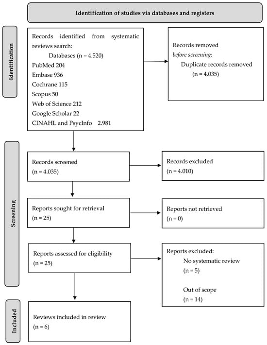 The search collected a total of 4520 articles (PubMed 204, CINAHL and PsycInfo 2981, Web of Science 212, Embase 936, Cochrane 115, Scopus 50, and Google Scholar 22). After the removal of duplicates, 4035 results were reviewed by title and abstract to assess relevance and eligibility criteria, eliminating 4010 records and including 25 papers. Finally, after eliminating 19 papers (n = 5 were not considered truly systematic reviews due to their methodology and n = 14 did not answer the research question posed for this umbrella review), 6 systematic reviews were analysed for the development of this research. Of the included reviews, three also included meta-analyses. The time range covered by the final reviews is from 2005 to 2022. The procedure followed in this umbrella review is described in Figure 1.