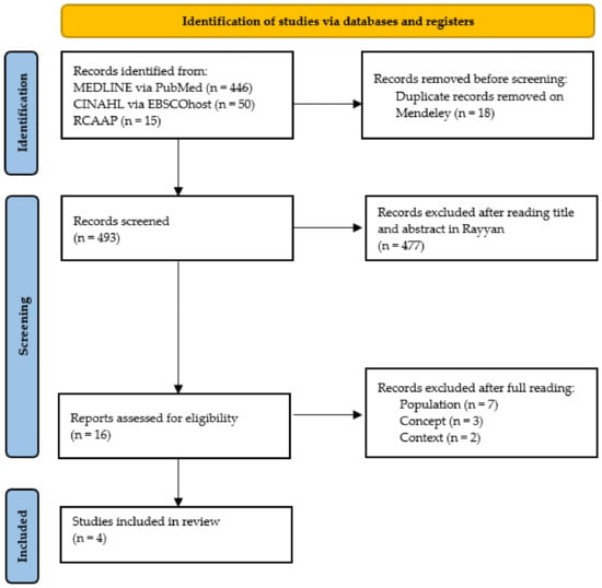 The results obtained through this process are presented in Figure 1 following the recommendations of “The PRISMA 2020 statement: an updated guideline for reporting systematic reviews” [23]. As depicted, the search identified 511 potentially relevant studies. Of these, 18 were excluded because they were duplicates; of the remaining 493 studies, 477 were excluded after the title and abstract assessment; and 12 out of the remaining 16 articles were excluded for not meeting the inclusion criteria after full-text reading. Ultimately, four studies were included in this review.