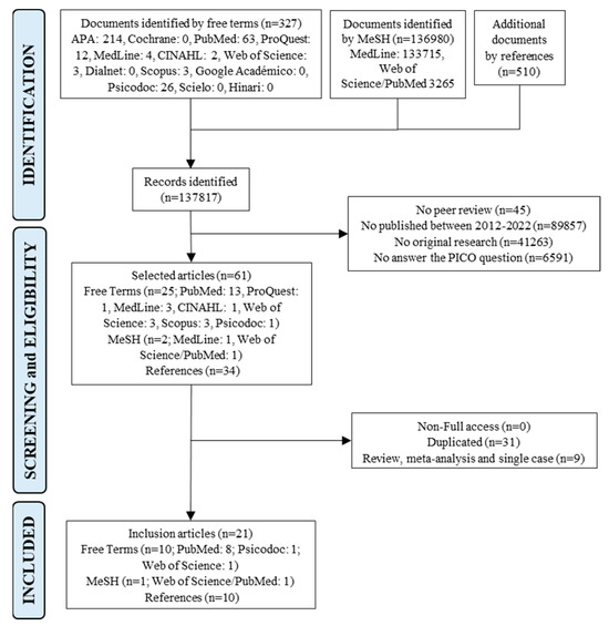 Firstly, a total of 137,817 documents were obtained (137,307 corresponding to databases and 510 from the references of the selected studies), which were filtered according to inclusion criteria, identifying 61 articles. These documents were carefully analyzed, reading the title and abstract. Secondly, articles that evaluated PPD or PTSD together with OV actions (i.e., episiotomy, the performance of the Kristeller technique or fundal uterine pressure maneuver, disrespect for the labor plan, rejection of social support, discrimination, among others) were incorporated, and non-full access, duplicated reviews, meta-analysis, and single cases studies were excluded. The articles that analyzed the satisfaction between healthcare of professionals and maternity were explored. Finally, a total of 21 articles were selected for this review: 10 using free terms, 1 using MeSH, and 10 derived from the reference list of the selected articles (Figure 1).