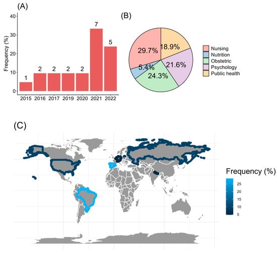 The present review found 21 studies that matched inclusion and exclusion criteria and were published between 2015 and 2022. The major rate of publication was found in 2021 (33.3%, 7/21; Figure 2A), with most of the articles published in English (95.2%, 20/21). The field expertise was in health sciences, specifically medicine, nursing, and psychology (Figure 2B). In addition, the studies were carried out in Europe, with 28.6% (6/21) from Spain. From America, Brazil reported 28.6%, and the United States added 9.5% of the studies. From Asia, it was found that 4.8% (1/21) from Nepal (Figure 2C).
