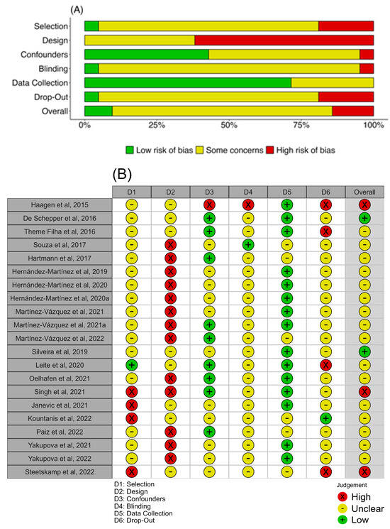 The articles showed a high proportion of “some concerns” in all analyzed domains, with a high risk of bias in the study design domain and low risk in the data collection domain since several tools showed significant reliability coefficients and validity (Figure 3A). The selection blinding and drop-out identification were the domains that showed unclear bias in most of the analyzed articles (Figure 3B).