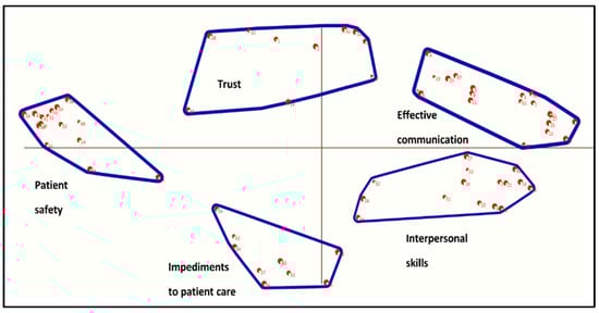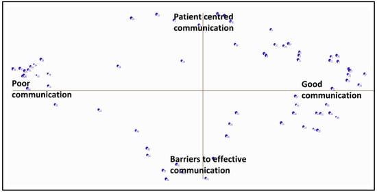 Concept maps locate individual statements and clusters on x- and y- axes (Figure 2). The statements on the x-axis represent the quality of communication between nurses and doctors. Statements and clusters located toward the west suggest poor communication while those toward the east suggest good communication. The y-axis reflects two concepts labelled “patient-centered communication” located toward the north of the map and “barriers to effective communication” located on the south.