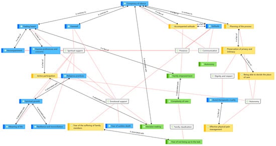 For both the patient and the family, common dimensions associated with the end-of-life suffering process and addressing their needs were identified. These dimensions are interrelated in Figure 1, with the dimensions shown in white, the common codes in blue, the patient-specific ones in yellow, and the family-specific ones in green (see Figure 1).