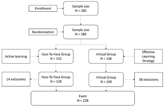 All first-year undergraduate nursing students (N = 280) were included in the study. All students were enrolled in the psychology subject in which this study was conducted. Students were assigned to both groups by simple randomization in a 1:1 ratio. One group (Face-to-face Active Learning Group) received the content (which can be seen in Supplementary Table S1) under the active teaching methodology in the format of case resolution, discussion in small groups (6 participants), presentation of conclusions, explanation, and direct feedback from the teacher. The other group (Virtual Active Learning Group) received the same content virtually under a methodology that we designed and called Effective Learning Strategy (ELS). Inclusion criteria included obtaining written informed consent, while exclusion criteria included not completing all course baseline questionnaires and examinations. A total of 280 first-year nursing students were recruited. After randomization, 38 participants in the virtual group and 14 in the face-to-face group were excluded from the analysis due to noncompliance with baseline questionnaires and examinations (Figure 1).