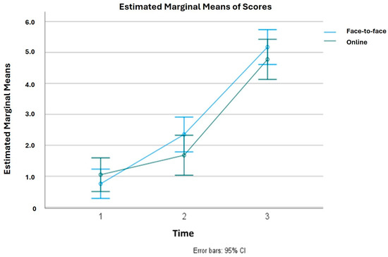 Although the face-to-face group generally showed better results, no statistically significant differences were observed between the groups in pre-intervention test scores (CG: 0.74 ± 2.25 vs. GI: 0.79 ± 2.15, p = 0.87), post-intervention scores (CG: 2.20 ± 2.56 vs. GI: 1.55 ± 2.74, p = 0.10), or final exam scores (CG: 5.12 ± 2.46 vs. GI: 4.75 ± 2.76, p = 0.32). Pre-post improvements were observed in both groups, with a higher mean score improvement in the face-to-face group (mean improvement in CG: 1.72; mean improvement in IG: 0.65, p = 0.03).