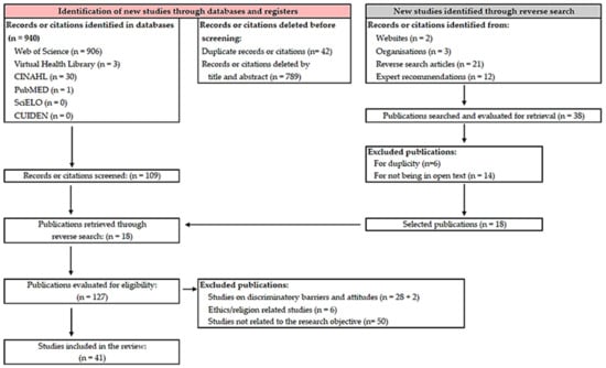 Our analysis of the available scientific evidence allowed us to retrieve a total of 940 articles. The use of Refworks® (ProQuest RefWorks 2.0, 2010) reference management software and the Covidence® (Covidence systematic review software, Veritas Health Innovation, Melbourne, Australia) screening and data extraction tool for conducting systematic reviews made it possible to eliminate 42 duplicates. A total of 18 additional documents were retrieved through the reverse literature search. Finally, once the eligibility and exclusion criteria were established, the total number of articles to be reviewed was 41, as shown in the flowchart (Figure 1).