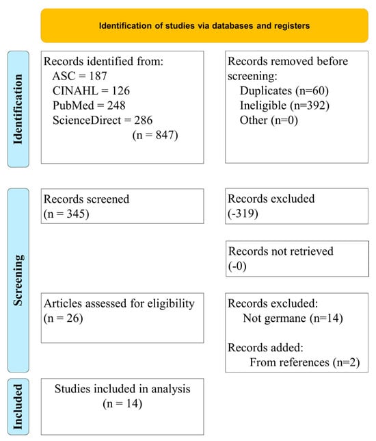 Additional filters were included during the search process to produce focused and applicable results. Further, articles were only included in the rapid review if the researchers agreed upon them. At least three researchers had to agree to include each article. First, PubMed was queried fully, and the date range of 2020 to the present was used; non-germane articles were removed, resulting in six articles. Second, CINAHL was queried with PubMed excluded, which resulted in the removal of repeated articles and those that were not germane, resulting in zero articles. Academic Search Complete was then queried with the same criteria, which resulted in the removal of repeated articles and those that were not germane, resulting in zero articles. Lastly, Science Direct was queried with the same criteria, which resulted in the removal of repeated articles and those that were not germane, resulting in six articles. References from these 12 articles were assessed, and two additional articles were identified for inclusion, ultimately resulting in the 14 articles included in this rapid review. Figure 1 illustrates the rapid review process and the applied search exclusion criteria.
