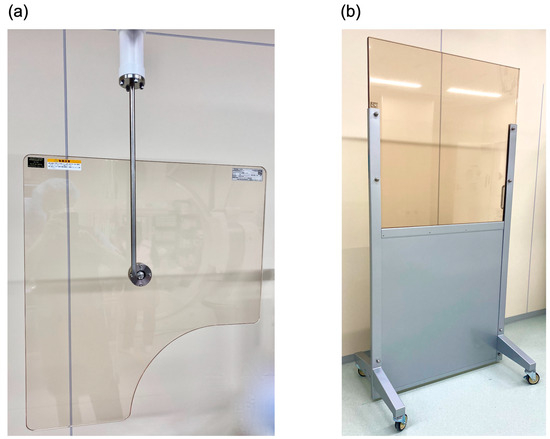 Lead lined radiation-shielding equipment installed in angiography rooms: (a) Ceiling-suspended lead shield (CSS) and (b) rolling lead shield (RS). The thickness of both is 0.5 mm Pb equivalent.