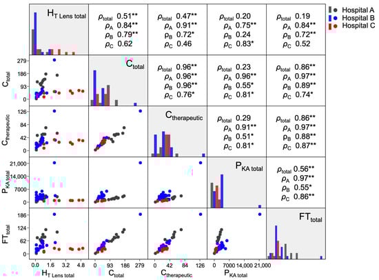 Figure 2 shows a scatter plot matrix of the associations between HT Lens total, Ctotal, Ctherapeutic, FTtotal, and PKA total. An analysis of how the four time-related parameters of Ctotal, Ctherapeutic, FTtotal, and PKA total were associated with each other at each hospital showed a moderate to strong correlation between every combination (0.51 ≤ ρA/B/C ≤ 0.97). Similarly, the results of an analysis of all three hospitals together showed strong correlations among three parameters, namely, Ctotal, Ctherapeutic, and FTtotal (0.86 ≤ ρtotal ≤ 0.96); however, they showed weak to moderate correlations between PKA total and these three parameters (0.23 ≤ ρtotal ≤ 0.56). In the analysis of all three hospitals together, HT Lens total was weakly to moderately correlated with all time-related parameters (0.19 ≤ ρtotal ≤ 0.51), and in an analysis of Hospital A alone, these correlations were particularly strong (0.75 ≤ ρA ≤ 0.91).