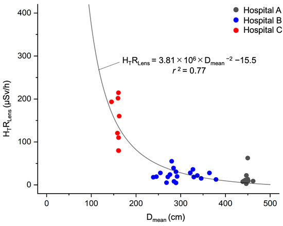 Association between lens-equivalent dose rate and mean distance between X-ray irradiation field and position of the IR nurse. The analysis population comprised 39 nurses whose HT Lens total values were ≥0.1 mSv. The curve was fitted using the least-mean-squares method. Dmean, mean distance between the X-ray irradiation field and the position of the IR nurse (cm); HTRLens, lens-equivalent dose rate (μSv/h); r2, coefficient of determination.