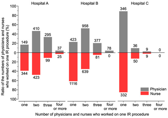 To explore the reasons for the underlying differences in Smean, we investigated the number of IR staff who worked on one IR procedure. Of the total of 3371 cases, 3118 cases were analyzed, wherein the number of both physicians and nurses were available; the number of IR staff differed significantly among the hospitals (Kruskal–Wallis test, p < 0.01; Table 3). According to the results of multiple comparison testing, the number of IR staff was significantly smaller at Hospital C than at Hospitals A and B (Mann–Whitney U test, p < 0.01; Table 3). The most common staff compositions in each hospital were two physicians and two IR nurses at Hospital A, two physicians and one IR nurse at Hospital B, and one physician and one IR nurse at Hospital C (Figure 6).
