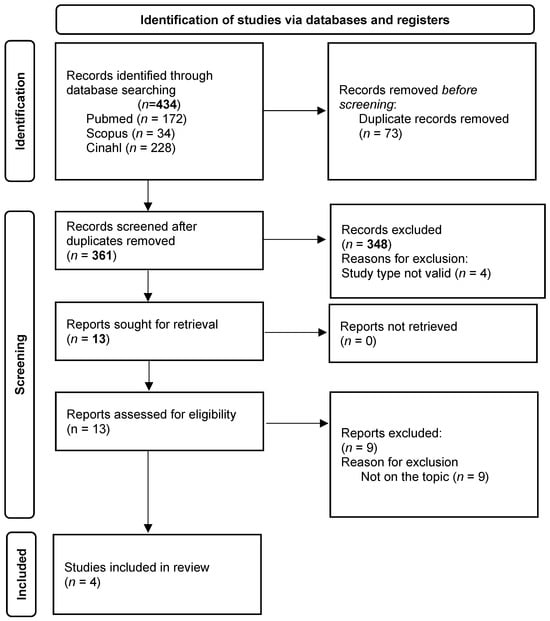 A total of 171 studies were identified and four were included [16] (Figure 1). These were all primary studies (Supplementary Material Table S4)—three based on a qualitative design [20,21,22] and one based on a cross-sectional design with an open-ended final question [23]. The studies were conducted in Italy [20,21], Finland [22] and Iran [23] in acute hospital settings [20,21,22]. The perspectives investigated were those of both healthcare professionals [20,22,23] and patients [21] involving from 14 [22] to 29 [20] participants in the qualitative studies and 462 [23] in the quantitative one. All studies were intended to explore the reasons for UNC as perceived during the pandemic, in the first months of 2021 [20,22,23] and between April and July 2022 [21], with well-designed and -conducted research methodologies.