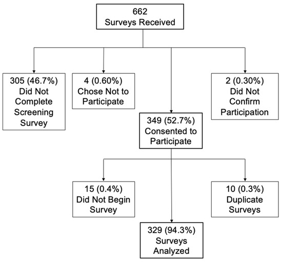 Of the 349 who passed the screening and agreed to participate, 15 did not start the survey and were removed. Ten respondents started the survey twice. Of the ten duplicate surveys, five were kept in the analysis. If the respondent had both an incomplete and complete survey, their incomplete survey was removed. If they had two completed surveys, their most recently completed were kept for analysis. A total of 329 surveys were analyzed (Figure 1).