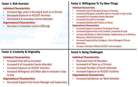 We also performed an EFA to confirm the survey items’ contribution to one of the four identified factors: Risk Aversion (Factor 1), Willingness to Try New Things and Being an Influencer and Leader (Factor 2), Creativity and Originality (Factor 3) and Being Challenged (Factor 4). From the survey results and the EFA, we were able to identify the correlates of innovative behavior (Figure 2).