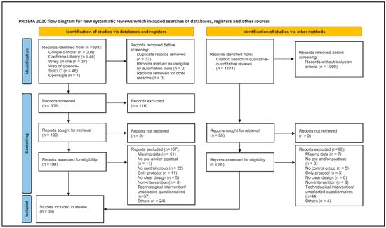 The search yielded 1512 records, of which 338 were identified in databases and 1174 in qualitative–quantitative reviews. A total of 32 records articles were eliminated. A review of the titles and abstracts was performed on 275 reports. The full text of 39 articles that met the inclusion criteria was reviewed (Figure 1).