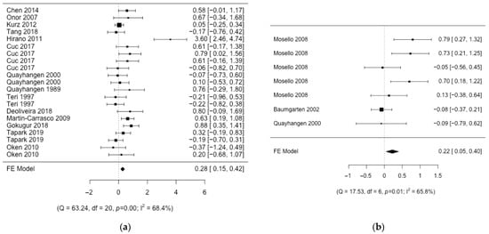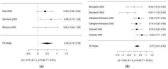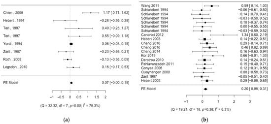 Forest plot of the different intervention groups. (a) Individual therapy; (b) respite care [,,,,,,,,,,,,,,].