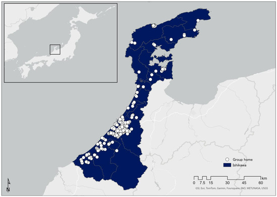 Location of Ishikawa Prefecture and geographical distribution of group homes.
