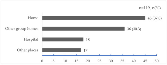 Regarding where participants lived before they were hospitalized, 45 (37.8%) said they were at home, 36 (30.3%) said they lived in another group home, and 18 (15.1%) said they lived in a hospital. Details are shown in Figure 2.