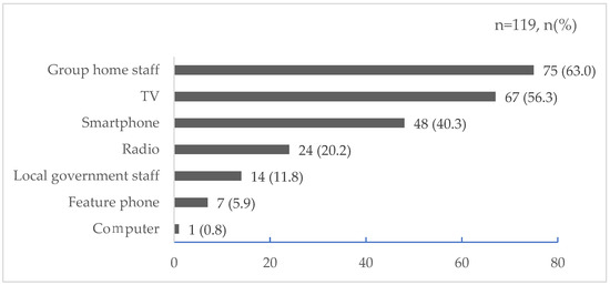 In recent years, social media platforms using smartphones have become an increasingly popular way to obtain information during disasters [30,31]. In Japan, disaster-related information has traditionally been provided through television broadcasts after a disaster occurs. In a 2016 survey, television was the most popular source for people’s disaster information [32], but in a 2022 survey, the younger people were, the more likely they were to obtain disaster information from their smartphones [33]. Furthermore, when choosing where to obtain information when deciding whether to evacuate, excluding group home staff who regularly support the daily lives of PMHI, people’s most common source of information was television and then smartphones, which is consistent with recent trends in Japan.