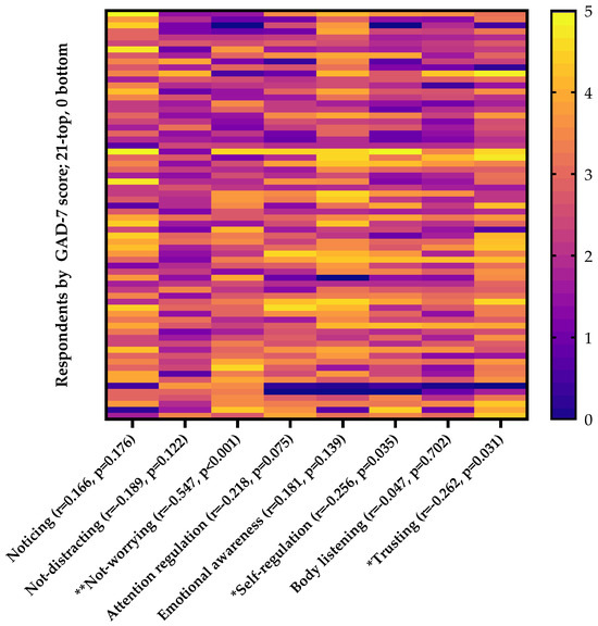 Heatmap of MAIA-2 subscales ordered by the respondents’ GAD-7 score. Rows represent individual respondents’ subscale scores, with respondents (n = 68) listed by decreasing GAD-7 scores from top to bottom. * p < 0.05; ** p < 0.005.