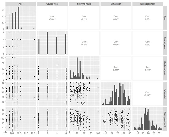 Students in higher course years had a higher age (r = 0.703; p-value < 0.001) and tended to dedicate fewer weekly hours to studying (r = −0.154; p-value = 0.017). Students who dedicated more weekly hours to studying reported a higher Exhaustion score (r = 0.141; p-value = 0.031). Both Exhaustion and Disengagement have negative correlations with Course year (r = −0.184, p-value = 0.004 for Disengagement and r = −0.143, p-value = 0.028 for Exhaustion), suggesting that as students progress in their academic journey, they may experience lower levels of these burnout dimensions.