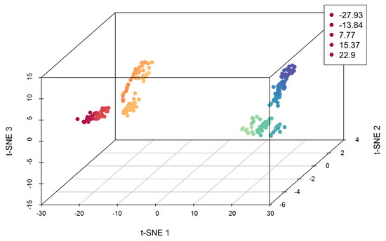 To delve deeper into the characteristics of the nursing students—specifically, age, year of the course, weekly studying hours, and the scores for Exhaustion and Disengagement—the t-distributed Stochastic Neighbor Embedding (t-SNE) procedure was employed [25]. A perplexity setting of 30 was chosen for the t-SNE analysis due to the diverse nature of the quantitative variables involved. This choice was favored over other dimensionality reduction techniques, such as Principal Component Analysis (PCA), to better capture the non-linear relationships between variables [25].