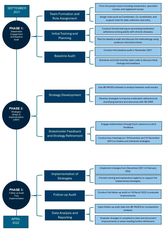 The first phase of the project focused on forming the project team and conducting an initial audit based on evidence-informed criteria. A central group of essential stakeholders, including researchers, specialist nurses, and registered nurses, was gathered to support the project’s aims. The project leader managed the development and oversight of the project, while the team members engaged in various tasks such as gathering data, providing feedback, and helping to implement strategies aimed at improving medication adherence in adults with chronic conditions. Team members, each bringing their own valuable expertise and knowledge, played roles that included support, data gathering, data entry, and active participation. The team was led by a coordinator, who was both a researcher and specialist nurse, tasked with overseeing the project coordination, audit management, and training. The co-coordinator, also a researcher, was tasked with strategy design and methodological support. Other team members included an additional researcher, a head nurse who served as a clinical facilitator, and two registered nurses responsible for data collection, designing educational materials, and applying research into practice. Together, this multidisciplinary group collaboratively conducted the initial and subsequent audits, using their collective skills to boost medication adherence. This phase of the quality improvement project was conducted from September to November 2021.