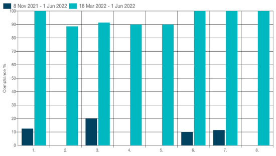 Compliance (%) with best practice for audit criteria (1 to 8) of medication adherence in adults with chronic diseases in primary healthcare at baseline (November 2021) and follow-up cycle (March 2022).