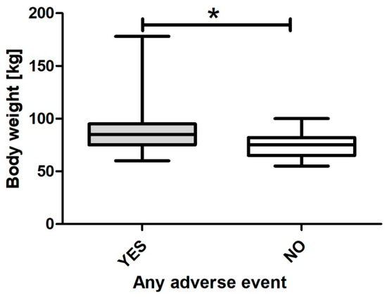 Higher body weight and higher body mass index (BMI) were associated with a greater number of adverse events (87.7 ± 20.5 kg vs. 74.4 ± 12.2 kg, p = 0.015, and 29.4 ± 6.3 kg/m2 vs. 25 ± 2.3 kg/m2, p = 0.006, respectively).