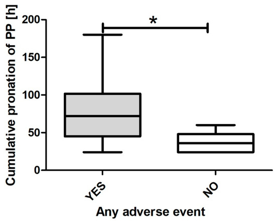 Additionally, we analyzed risk factors for the development of adverse events during PP. The cumulative duration of PP was longer in patients with any adverse event compared to patients without adverse events (76.7 ± 38.2 h vs. 37.3 ± 12.1 h, p = 4.3 × 10−4). Also, a higher number of PP sessions was associated with more adverse events (2.3 ± 1.3 sessions vs. 1.1 ± 0.3 sessions, p = 4.8 × 10−4) (Table 5). However, the duration of individual sessions was observed only for the second PP session (the duration of the first session was 24 h as per departmental strategy). The occurrence of a second PP session was associated with a higher EPUAP stage pressure ulcer on anterior face (p = 0.024; ρ = 0.290), on anterior thorax (p = 0.03; ρ = 0.279), on other locations of the body anteriorly (p = 0.006; ρ = 0.348), and pressure ulcer anywhere anteriorly (p = 0.006; ρ = 0.347). The occurrence of a third and fourth PP session did not correlate with a higher EPUAP stage pressure ulcer, most likely because of a lack of power.