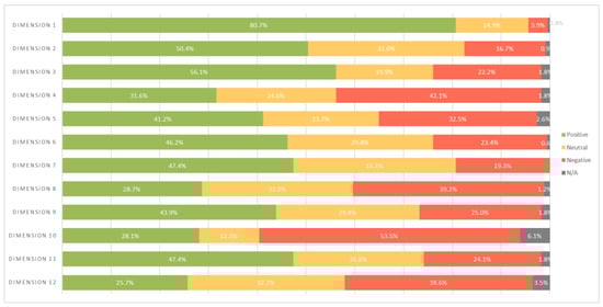 In terms of the items in the dimensions analysed, it was found that only dimension 1 (teamwork) was positive above the predefined criteria, making it a strong dimension with around 80.7% of positive responses. Dimensions 2 and 3 (supervisor/manager expectations and actions promoting patient safety and organisational learning—continuous improvement, respectively) were identified as neutral. The remaining dimensions had all items with an average percentage below 50%, and as such, represent an opportunity for improvement, as shown in Figure 1.