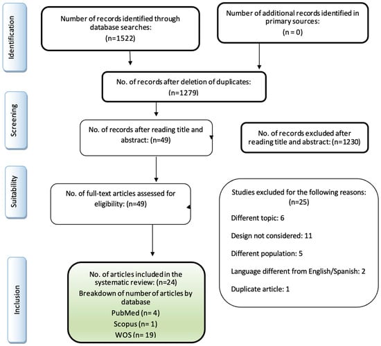 A total of 1522 articles were identified from the initial search of databases. After removing duplicates (n = 243), the title and abstract of 1279 records were assessed, leaving a selection of 49 selected at this stage. No additional references were identified through a manual search in websites or reference lists. After a full reading of the 49 articles, 25 of them were excluded: 6 for having a different topic, 11 articles for being a different type of research study, 5 for being conducted in a non-palliative population, 2 for being written in a language other than English/Spanish and 1 article for being duplicated. Finally, 24 articles were included in the systematic review (Figure 1).