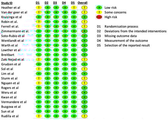 Risk of bias assessment (RoB2) [22,23,24,25,26,27,28,29,30,31,32,33,34,35,36,37,38,39,40,41,42,43,44,45].