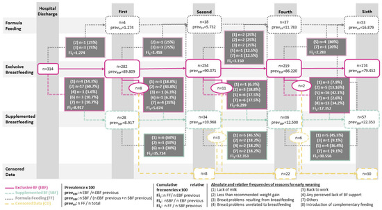 Figure 1 shows the evolution of breastfeeding over the first six months of the infants’ lives. Each monitoring point is shown in the columns of the figure. The rows show the different types of feeding and the absolute frequencies and prevalence (prev) of infants fed each type of feeding throughout the follow-up period. Between one monitoring point and the next, the flow of infants who change their feeding type is shown, making it possible to identify the absolute and relative frequencies of the main reason for the change in feeding and the respective accumulated relative frequencies (Fi).